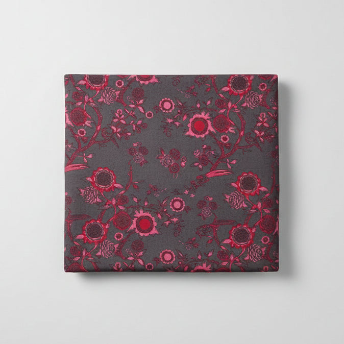 The A.11.02 pillow sham is bold yet poetic. Vivid crimson and deep rose florals sit against a chocolate base, with hand-drawn details that add movement and warmth. Screen printed on linen fabric with a soft sheen, it brings rich, layered depth—making a statement without overpowering the bed.