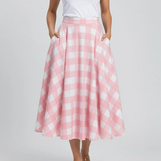 The Elan Skirt has an effortless lightness — made for movement, laughter, and ease. Crafted from fine cotton in soft pink and white checks, it features a high waist and full, flowing silhouette that blends playful charm with timeless grace.