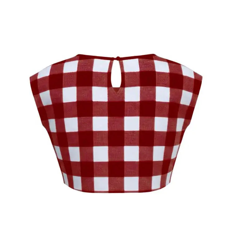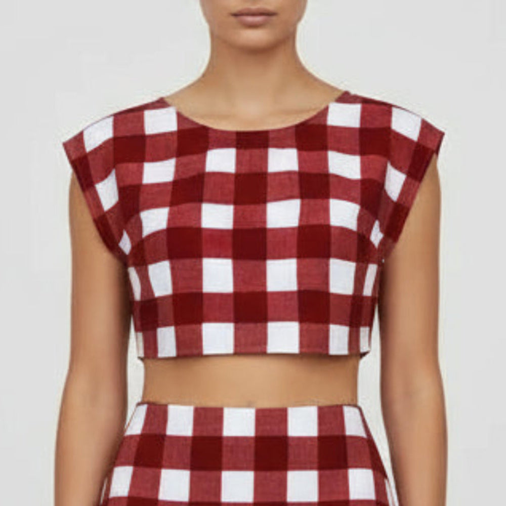 The Ona Top in deep crimson and white check carries quiet boldness with effortless charm. Crafted from premium cotton with a smooth finish, it features a cropped silhouette and soft boat neckline. Simple yet striking — perfect for easy days with a hint of statement.