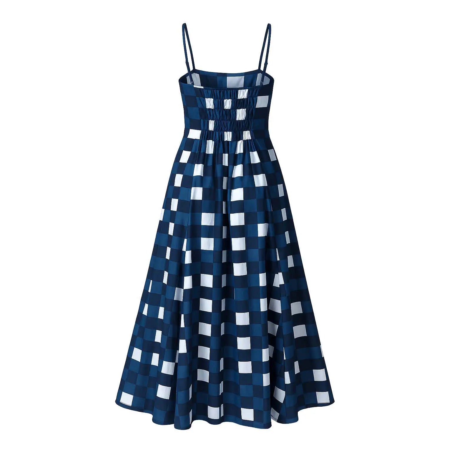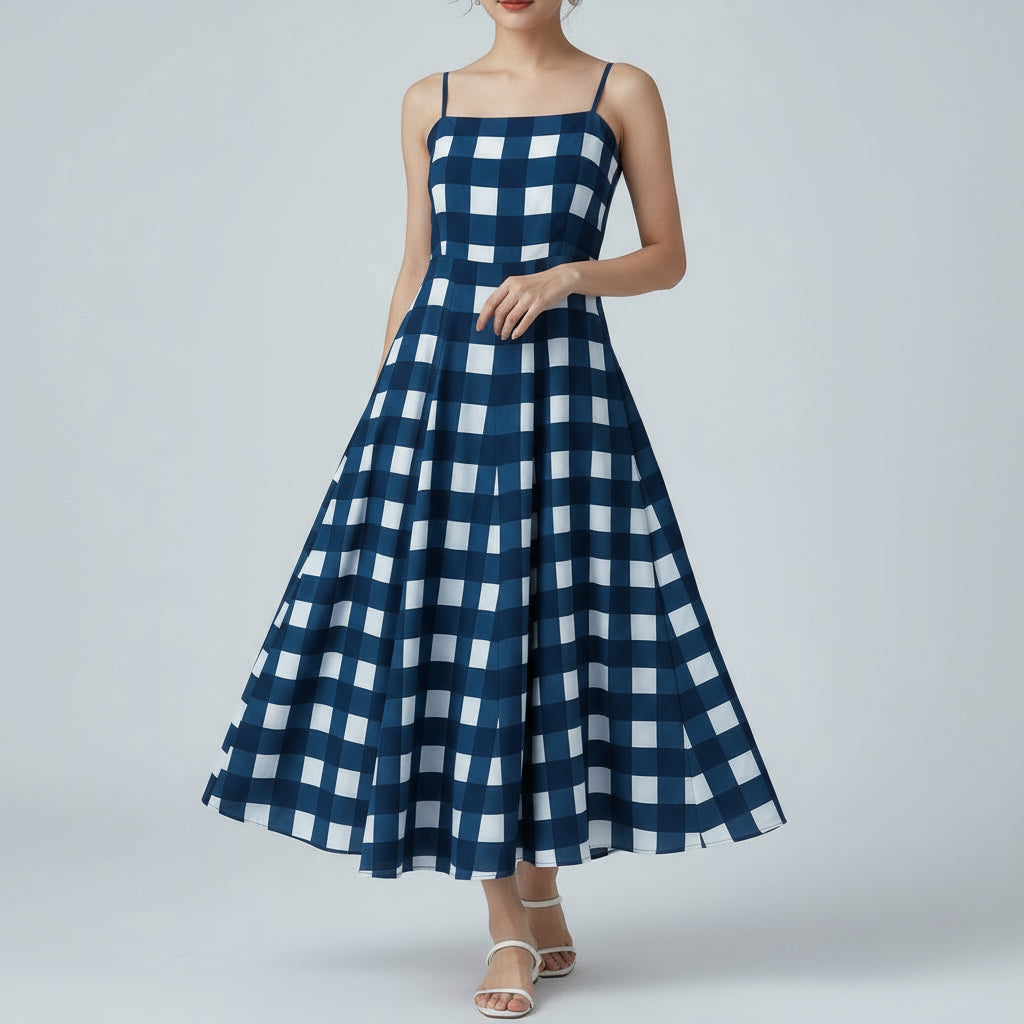 The Sora Dress in C.11.01 is airy, elegant, and effortlessly wearable. Hand-printed in a midnight slate check — a deep, cool blue with hints of gray — it brings playful rhythm to a timeless silhouette. Crafted from smooth, premium cotton with a soft drape, it features a gently structured bodice, slender straps, and a flowing skirt — light, feminine, and perfect for any easy day.