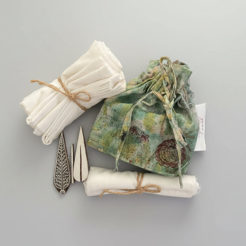 The packaging itself carries a story too — it’s made from the cloth used to cover our print tables (achara), fabric that would otherwise be discarded. Reused, repurposed, and given a second life.