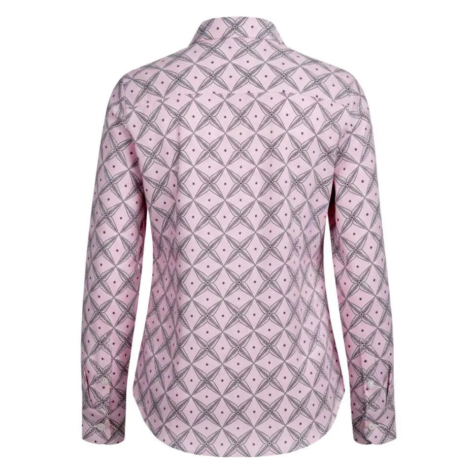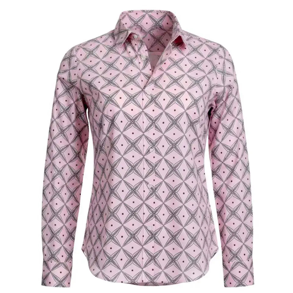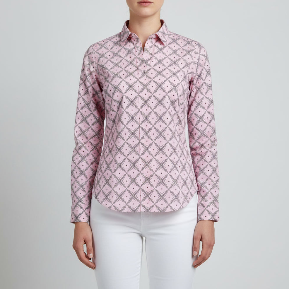 The Noya Shirt in C.11.05 pairs classic tailoring with playful geometry. Hand block-printed on soft blush cotton with a delicate lattice pattern, it balances crisp structure with easy drape. Finished with a pointed collar and button-down front, it works effortlessly from polished layers to relaxed everyday wear.
